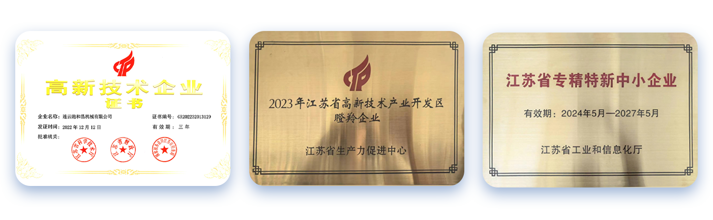 企业先后获得国家高新技术企业、江苏省瞪羚企业、江苏省专精特新中小企业、新四板成长板挂牌企业,2024年通过市首台(套)重大装备认定和江苏省“两新”评定。